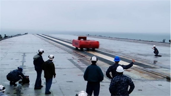 (图解:福特号电磁弹射器放飞弹射小车画面,其测试方面的进展,远慢于中国福建舰)
