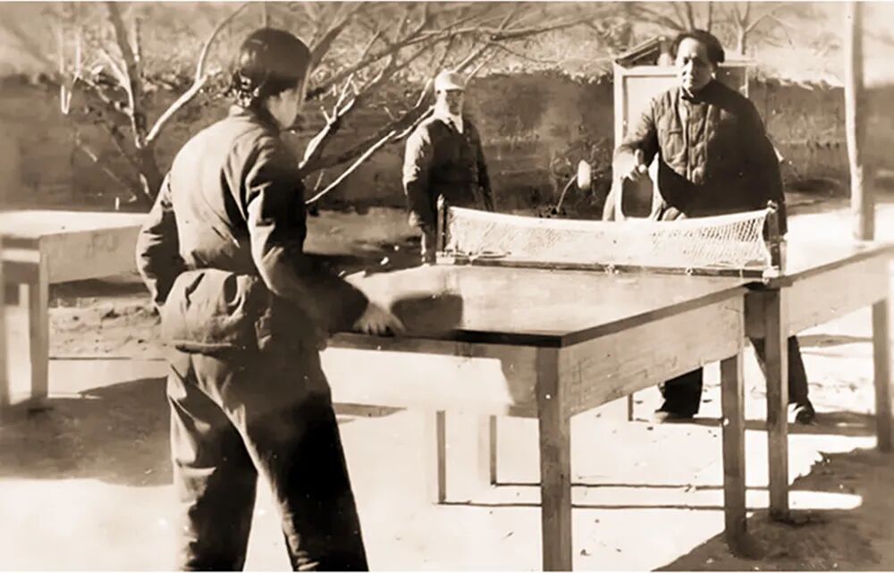 主席与江青的延安岁月镜头下,江青身着棉衣棉裤,头上的粗辫子闪烁着活力,热情投入地陪着主席打乒乓球。
