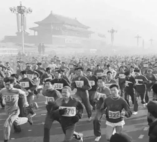 ▼1960年1月30日,一年一度的北京春节环城赛跑,人们从天安门广场开始跑起。