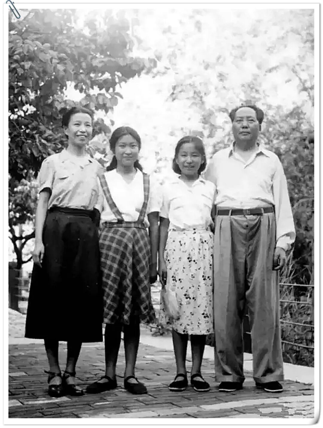 这张50年代拍摄的照片上,主席和江青带着李讷、李敏合影,家庭氛围温馨而和谐。主席身穿白衬衣和布鞋,展现出他的简朴风格;江青则身穿裙子、黑色皮鞋,显得优雅而端庄。在主席子女中,李讷是幸福的一位,因为她一直生活在父母身边。