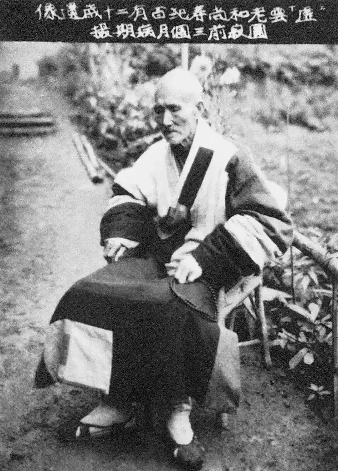 1959年,释虚云留下了他生涯的最后一张照片。在这张珍贵的照片中,他身着僧侣传统的百衲衣,双眼紧闭,如同深邃的湖水,宁静而深邃。他的脸庞虽然布满岁月的痕迹,但每一条皱纹都仿佛在述说着他一生的修行和智慧。