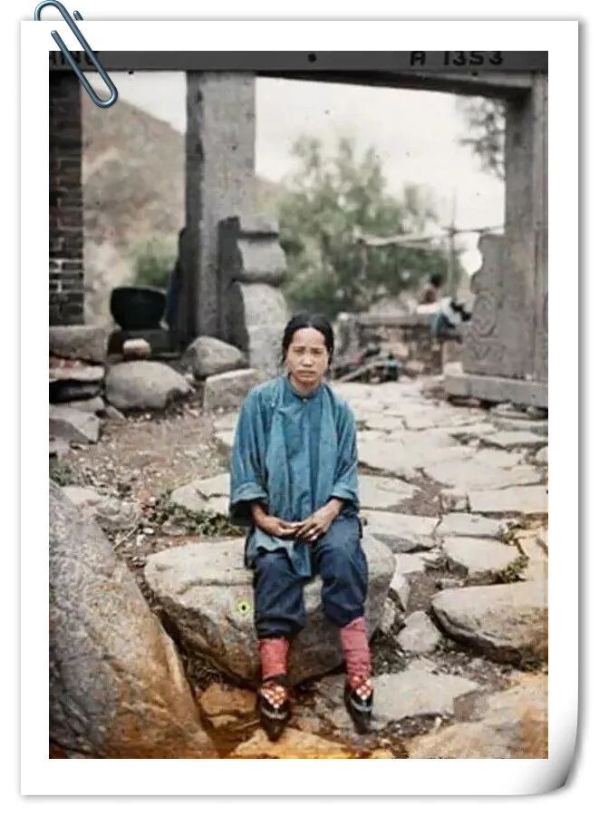 一个清朝少女,表情十分忧郁,但不是乞丐,只是生活过于贫困。她的小脚令人注目,因为她缠足了,属于典型的封建时代小脚女子。