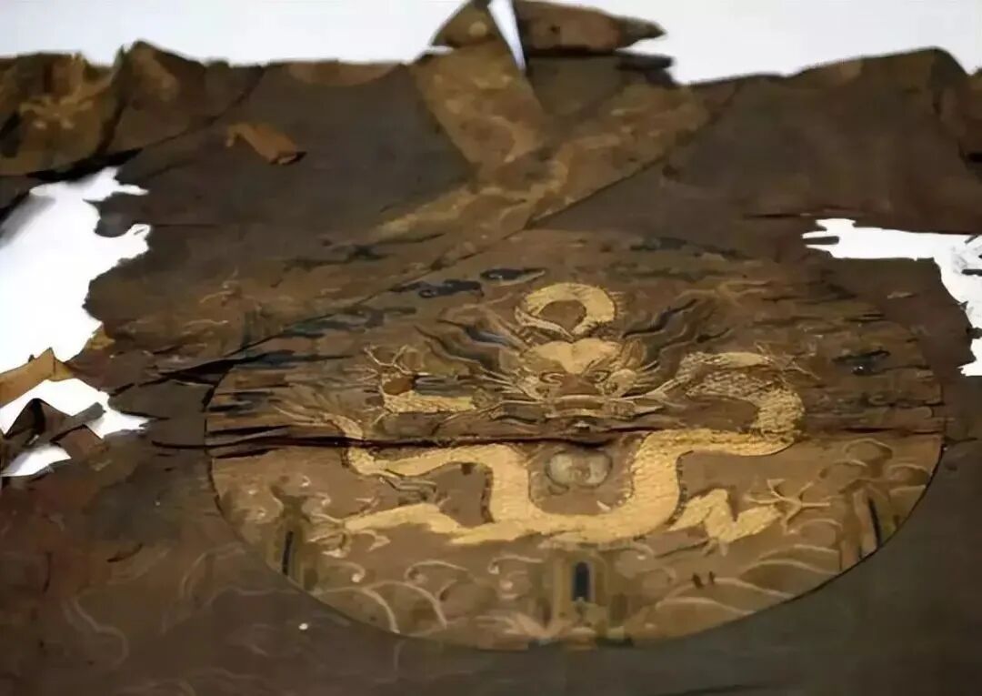 如今定陵博物馆里展出的,都是后人用现代技术仿制的复制品,当年真品的丝织服饰,仅剩下少数还镶嵌着金银玉饰的织料残片。