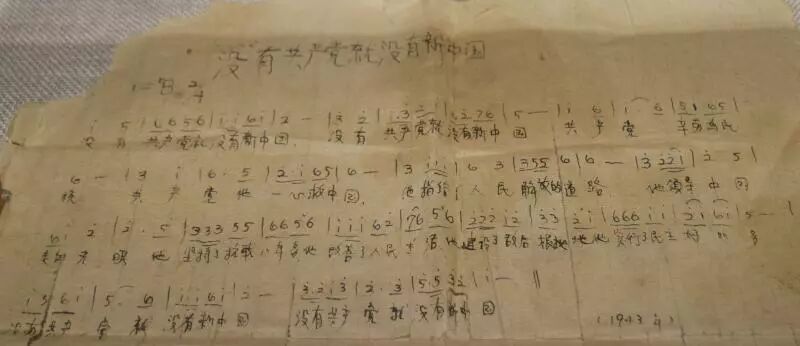 坐在东厢房的土炕上,点着小油灯,曹火星很快写就了歌词,他一遍遍地念着、改着,心中充满激情。接着,他趁热打铁开始谱曲,家乡的民间小调、戏曲曲调接连涌来,眼前浮现出孩子们打着“霸王鞭”行进演唱的景象。降b调,2/4节拍,要旋律流畅、节奏感强,还要宜于学唱,朝着这个目标,曹火星反复修改,当最后几句连续上扬的高音旋律跃出时,他酣畅的激情完全得到释放,经典名作《没有共产党就没有中国》诞生了。