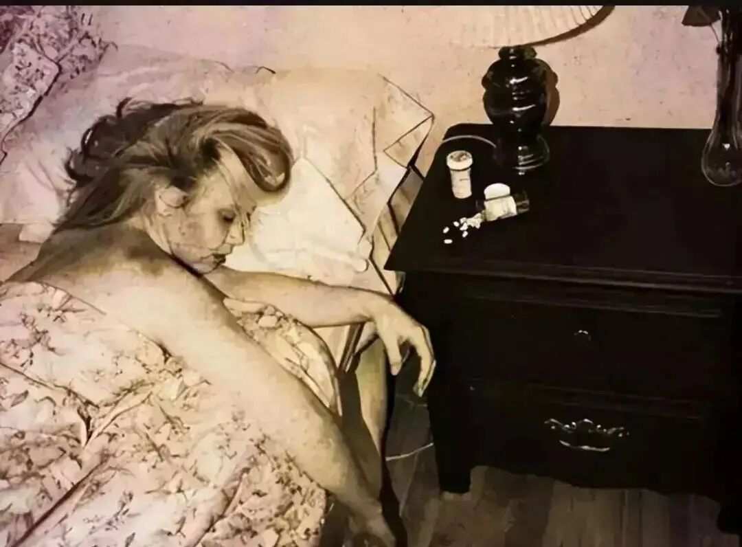 1962年,梦露的最后一张遗容,镜头中的她,头发凌乱,如同刚刚经历了一场风暴,全身无力的趴在床上,那曾经让无数男人陶醉的完美身姿,现在已经变得僵硬且毫无生气。她的床头,摆放着一个个装药的瓶子,而在她的手边,还有15片有助安眠的药物。这些细节仿佛在诉说着她生前无尽的痛苦与挣扎。