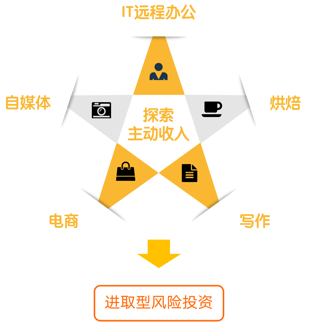 在基础资产模型之上,再通过探索新的赚钱方式,获得主动收入。主动收入将用于进取型风险投资,期望获得额外收益,这便是探索收入模型。