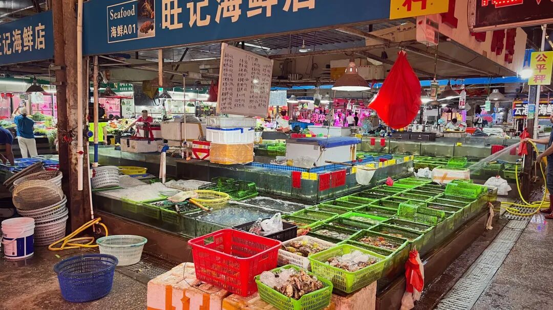 菜市场的肉和海鲜要比社区团购新鲜很多。今天早起逛了一圈,牛肉55元/斤、芝麻斑98元/斤,因为靠近海边带点景区属性,肉类和海鲜会有溢价,但还不算离谱。