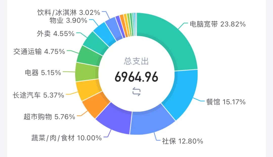 截图是我八月份的支出情况,不包括太太的支出。因为是第一个月,有很多超出计划范围的事项,比如宽带网络、外食、搬家货运、购买电器等等。待后续稳定后,基础的月支出不会超过5000元,我俩合计月支出大概在1万元左右。
