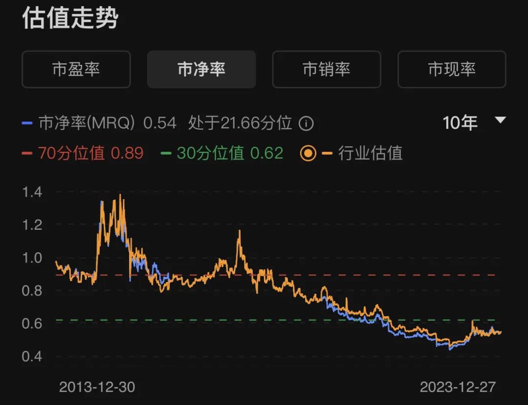 个人观点:从近十年的纬度来看,农行的市净率尚位于相对底部位置。当然,这个估值是把地产困境、城投债危机、经济下行等不利因素计算在内的,如果假以时日,通过时间化解问题,银行极有可能迎来估值修复。