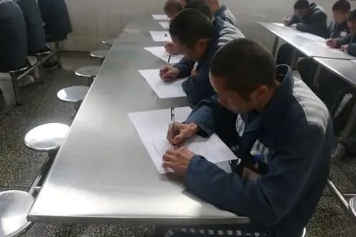 进屋后,在事务犯的指示下,放好个人物品,然后在学习桌两侧,盘腿坐下。