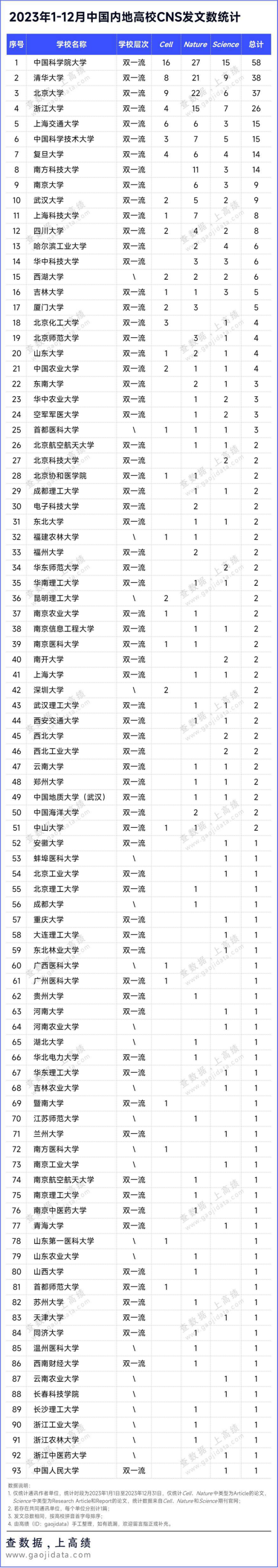 2023年1月1日至12月31日,中国内地共有93所高校发表了276篇CNS论文,其中包括Nature期刊的138篇、Science期刊的84篇以及Cell期刊的54篇。