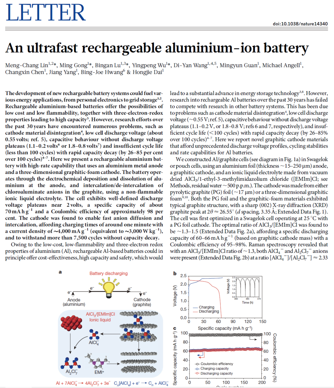 源材料的研究:他发展了多种碳纳米材料和无机材料的复合体系,用于提升电催化、水相电池、铝离子电池等的性能。他的铝电池发明获2016年美国R&D100 Award,其产业化与清华深圳研究院等国内单位密切合作,已进入中试阶段。