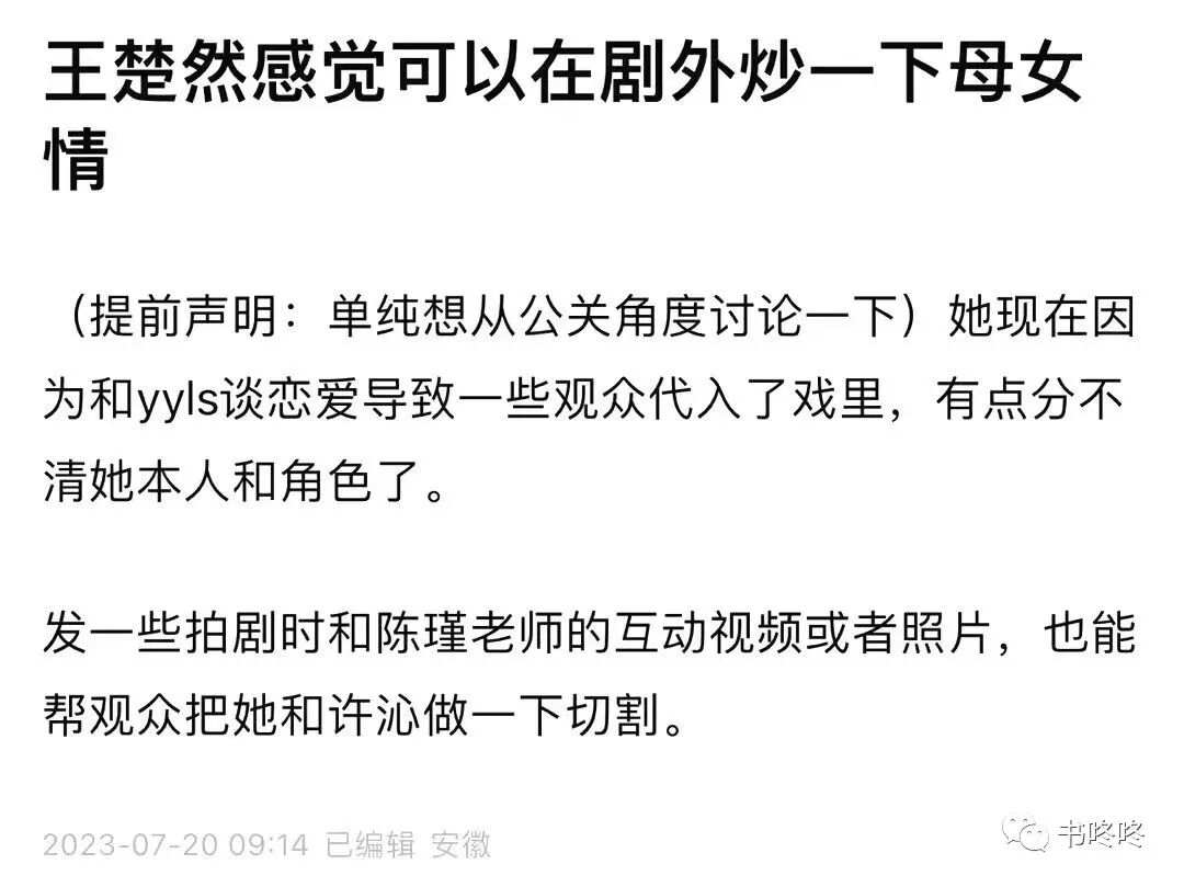 有网友感叹:王楚然太不会来事了,如果剧播出的时候她发这篇微博,肯定会挽回许多人气,现在口碑已经崩了,亡羊补牢为时晚矣。