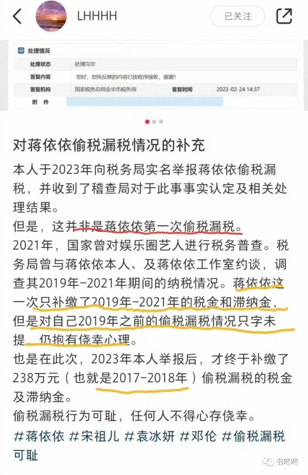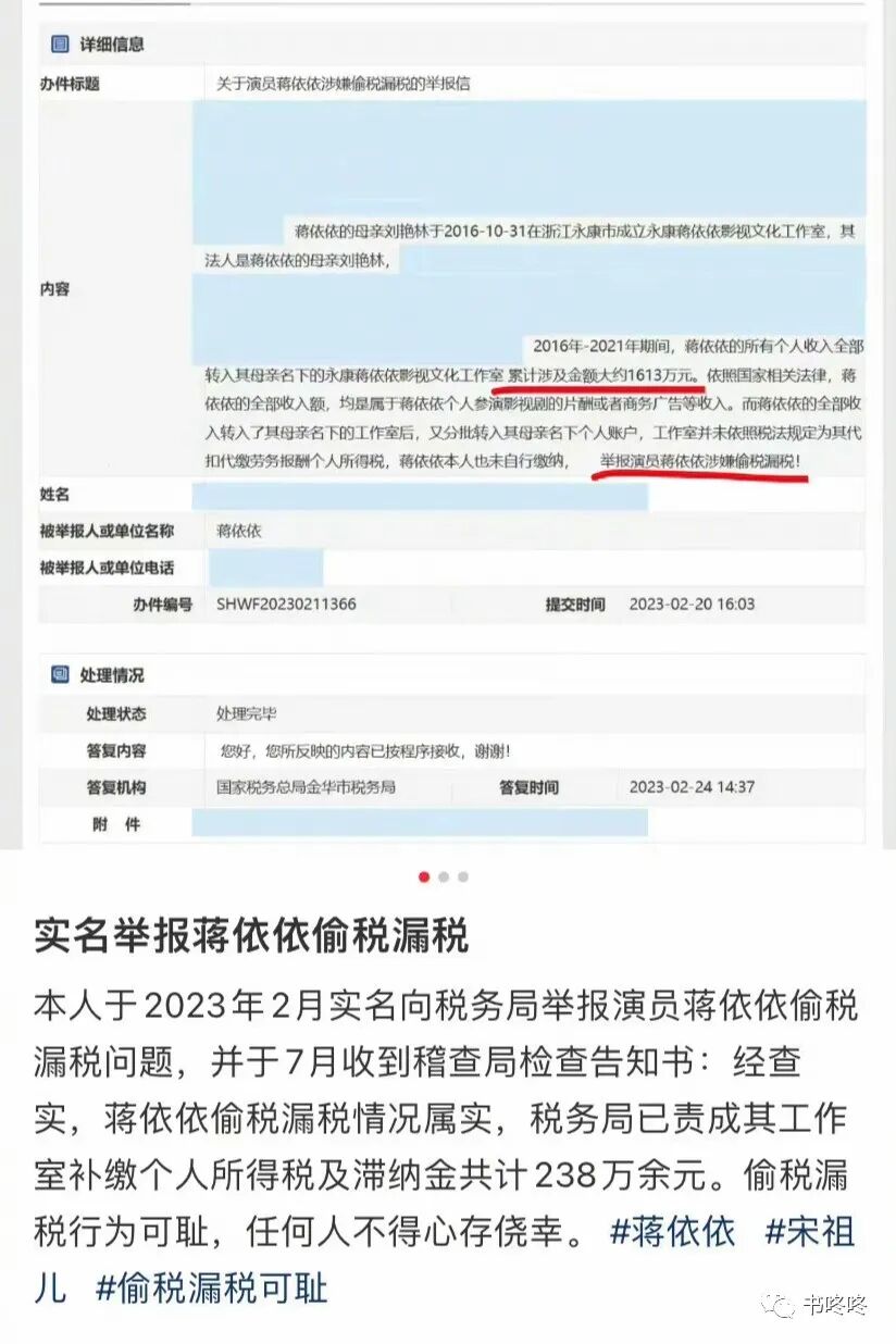目前宋方无回应,蒋依依工作室表示:税已补齐,不存在侥幸心理。
