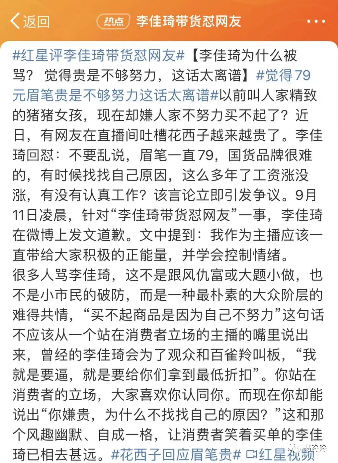 而李佳琦类似资本家无法共情打工人的言论,受到了许多网友的抵制。