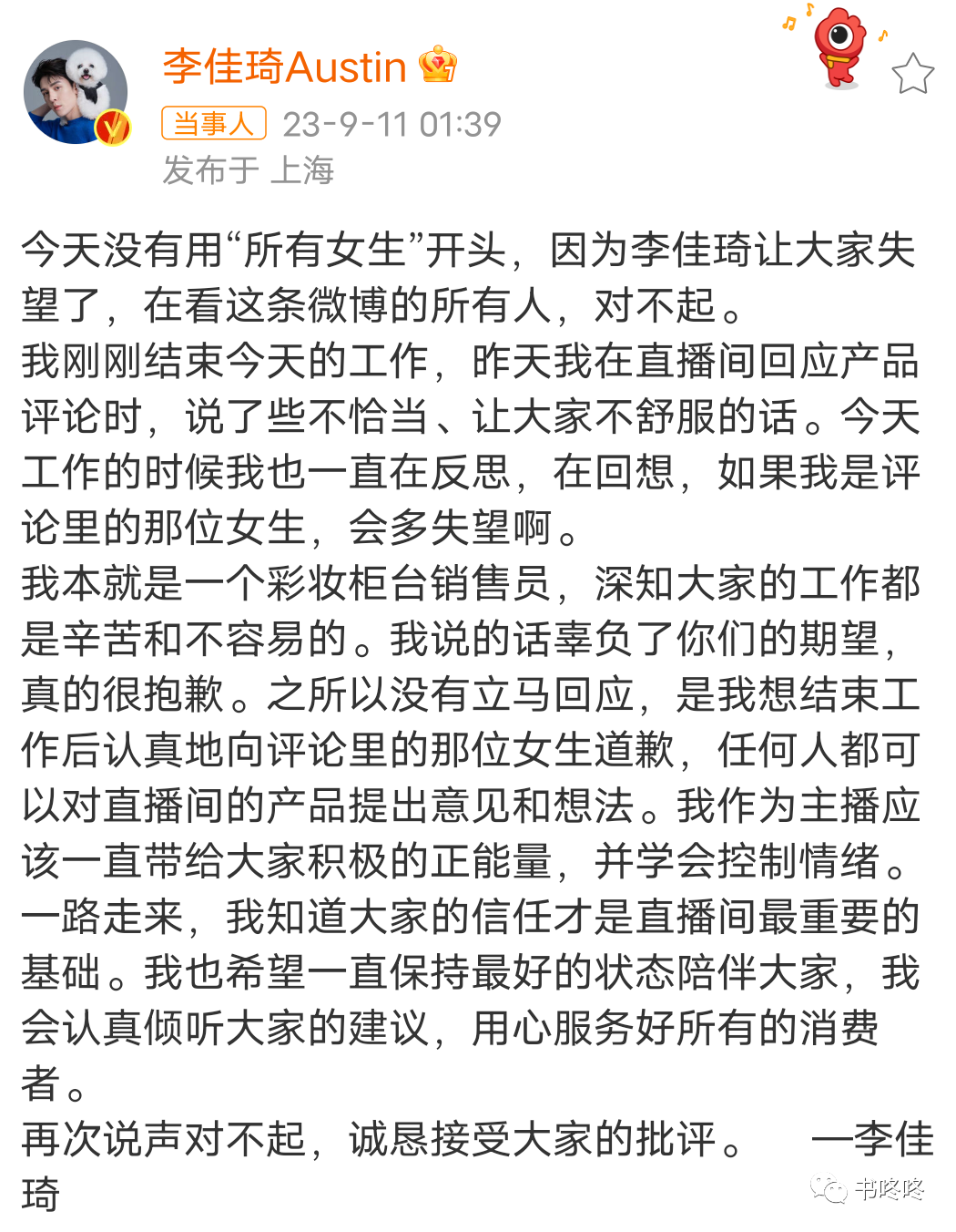 这一次“花西子”事件刚被爆出的时候,他也道歉了,但是显然没有意识到事情的严重性。