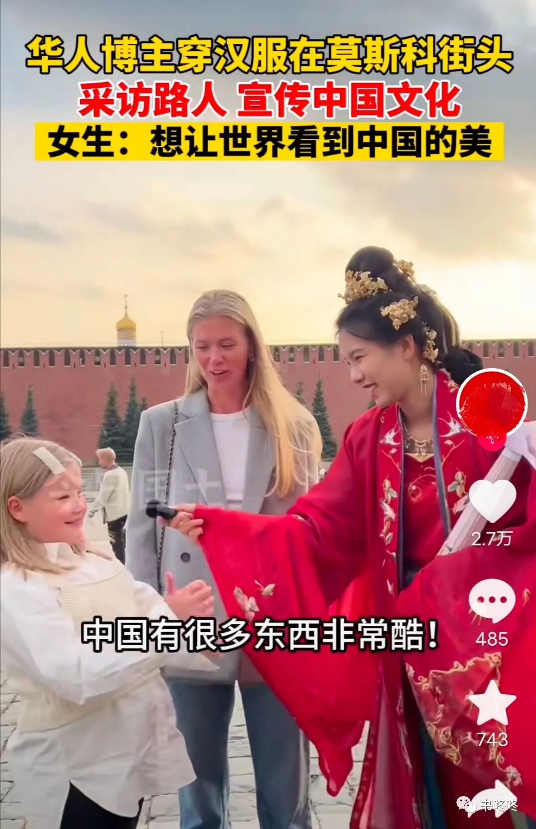 许多博主小姐姐都穿着汉服到外国的大街上游玩,看到路人询问的时候,会自豪的说“这是汉服”。