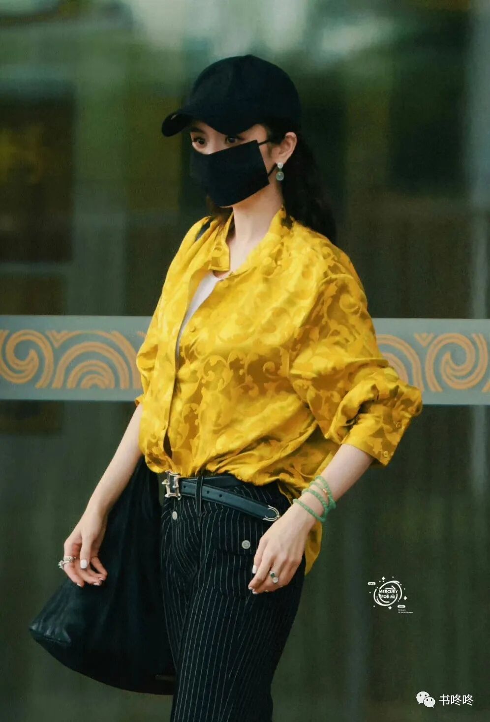 明黄色衬衫,搭配一件竖条纹长裤,增添了一些帅气。