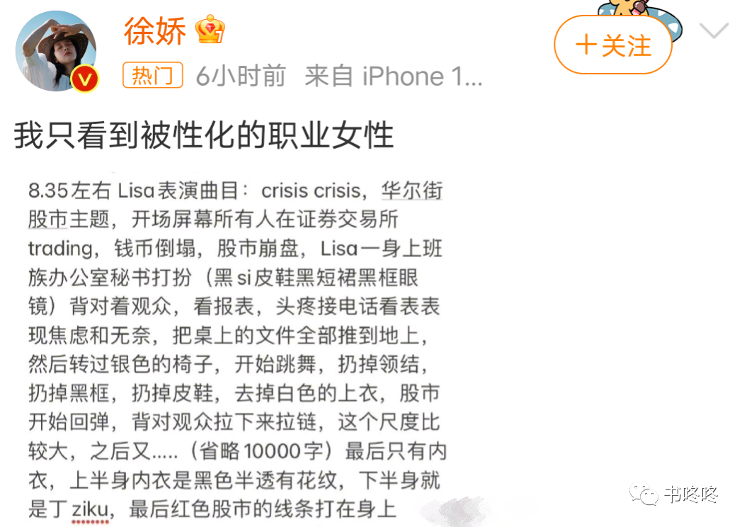 女明星徐娇首先发声,公开表示自己对疯马秀的看法。