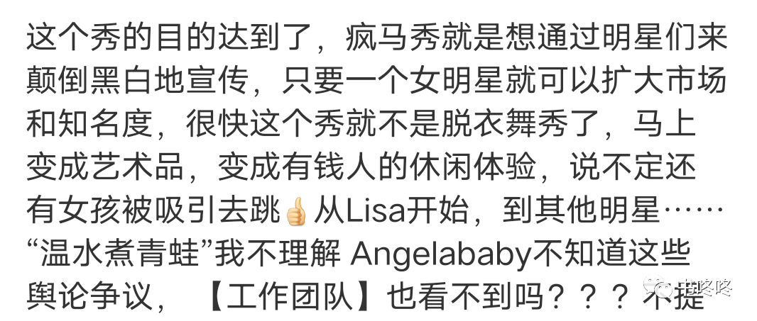 有网友趁机说她双标,Lisa在疯马秀的舞台上穿的并不比她少。