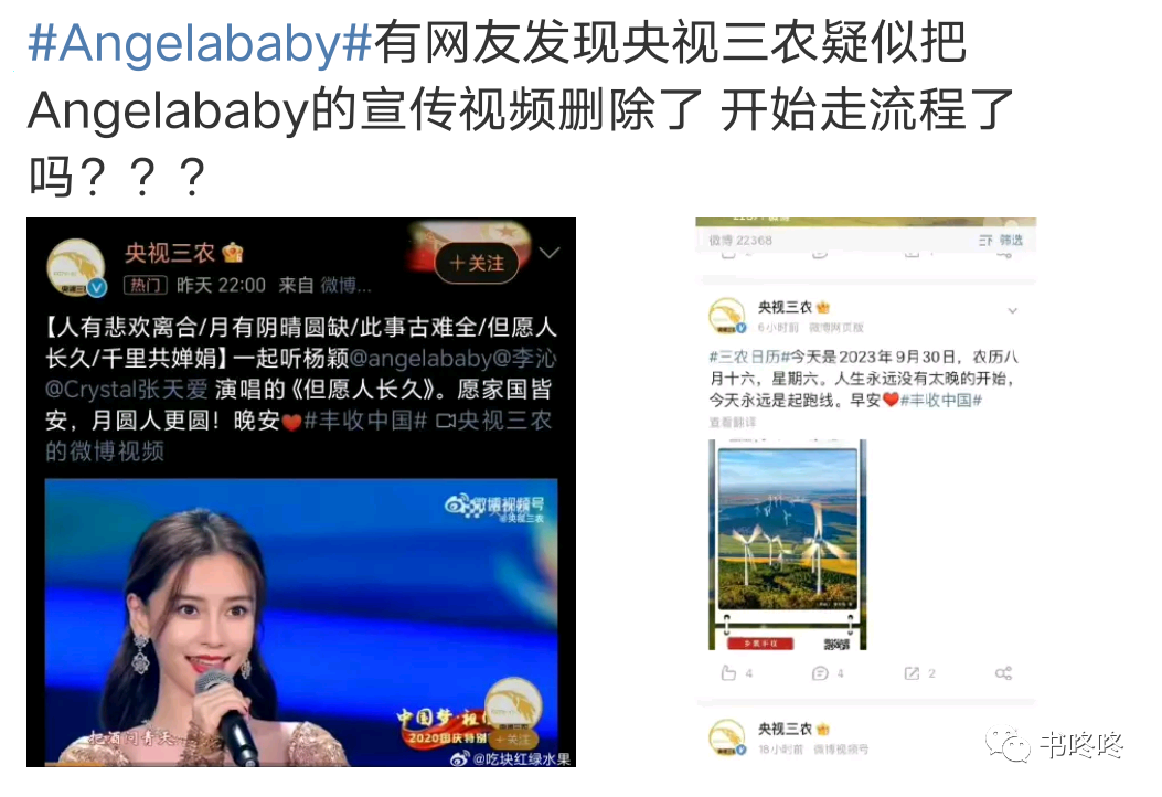 有网友发现,在事情爆出的时候,央视三农已经删除了有关杨颖与中秋节的物料。