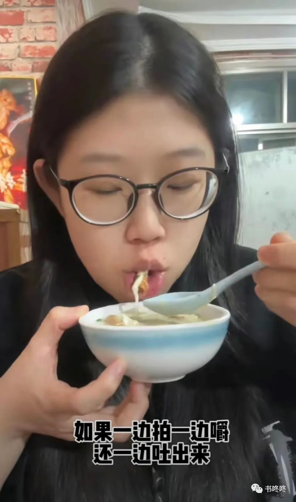真实情况可能就是网友想的那样,她是嚼吐,咬下一口食物,随意咀嚼两下,另一只手按下暂停键,然后拿出准备好的塑料袋吐进去,如此循环往复。