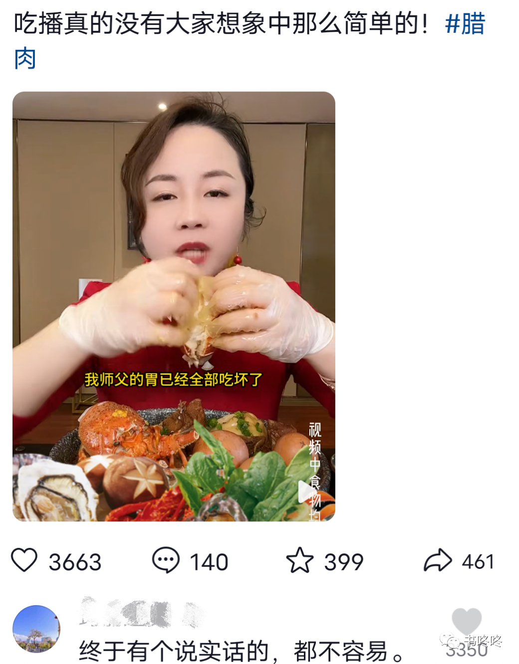 许多做吃播的人都承认过这个行业确实不好做,即便很撑了还得吃,天天吃东西,再美味的东西吃到嘴里也不好吃了。