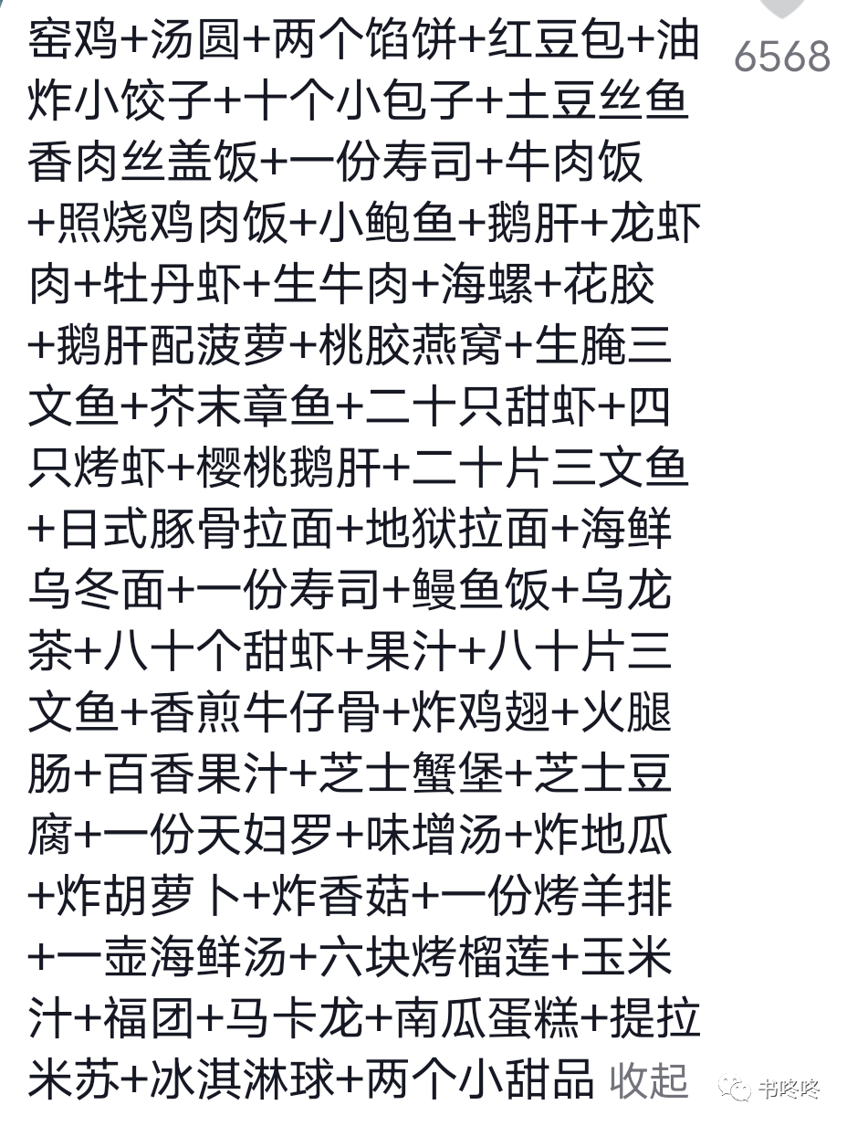 有网友总结了她自助餐吃的东西,跟往期视频里的量完全不能比,她这次吃的量,许多普通人都比她吃得多。