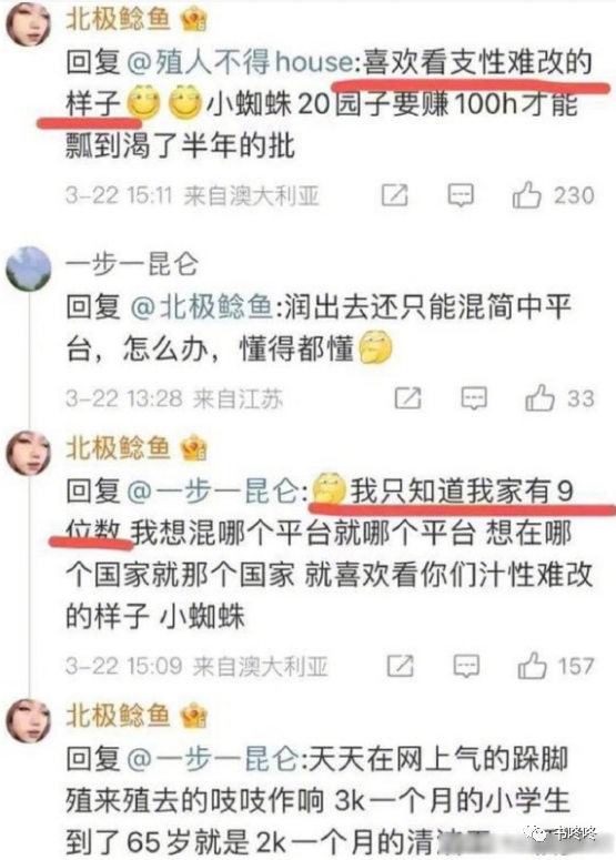 根据她自己所说,家里存款有九位数,国人只是她家的韭菜。