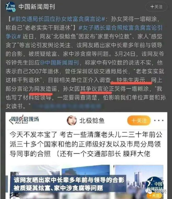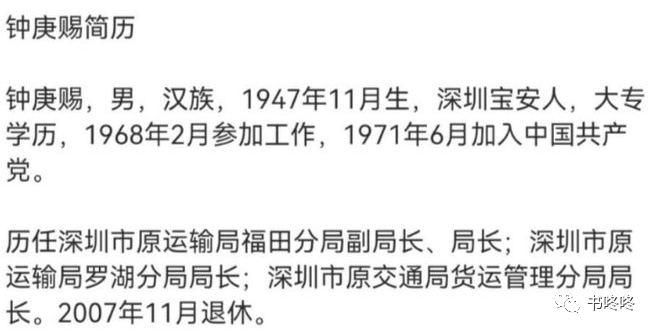 顺着北极鲶鱼这条线,网友成功扒出她口中所说的做高官的爷爷,应该就是深圳市做过各种官职,如今已经退休的钟庚赐。