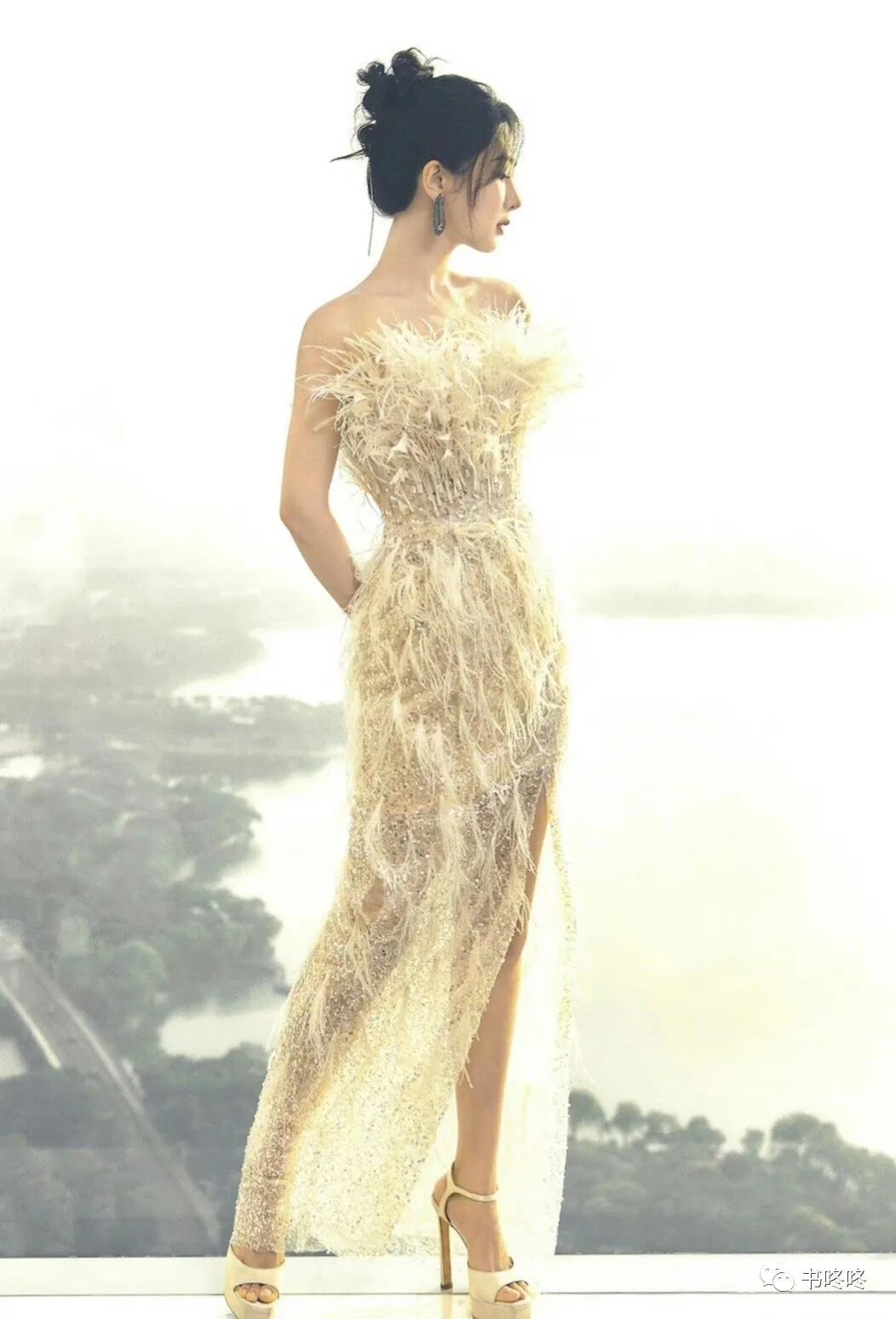 羽毛造型长裙搭配高跟鞋,视觉上拉高了身材比例,妆容也是亮晶晶的,卧蚕处用了细闪,达到了造型整体的高度统一。