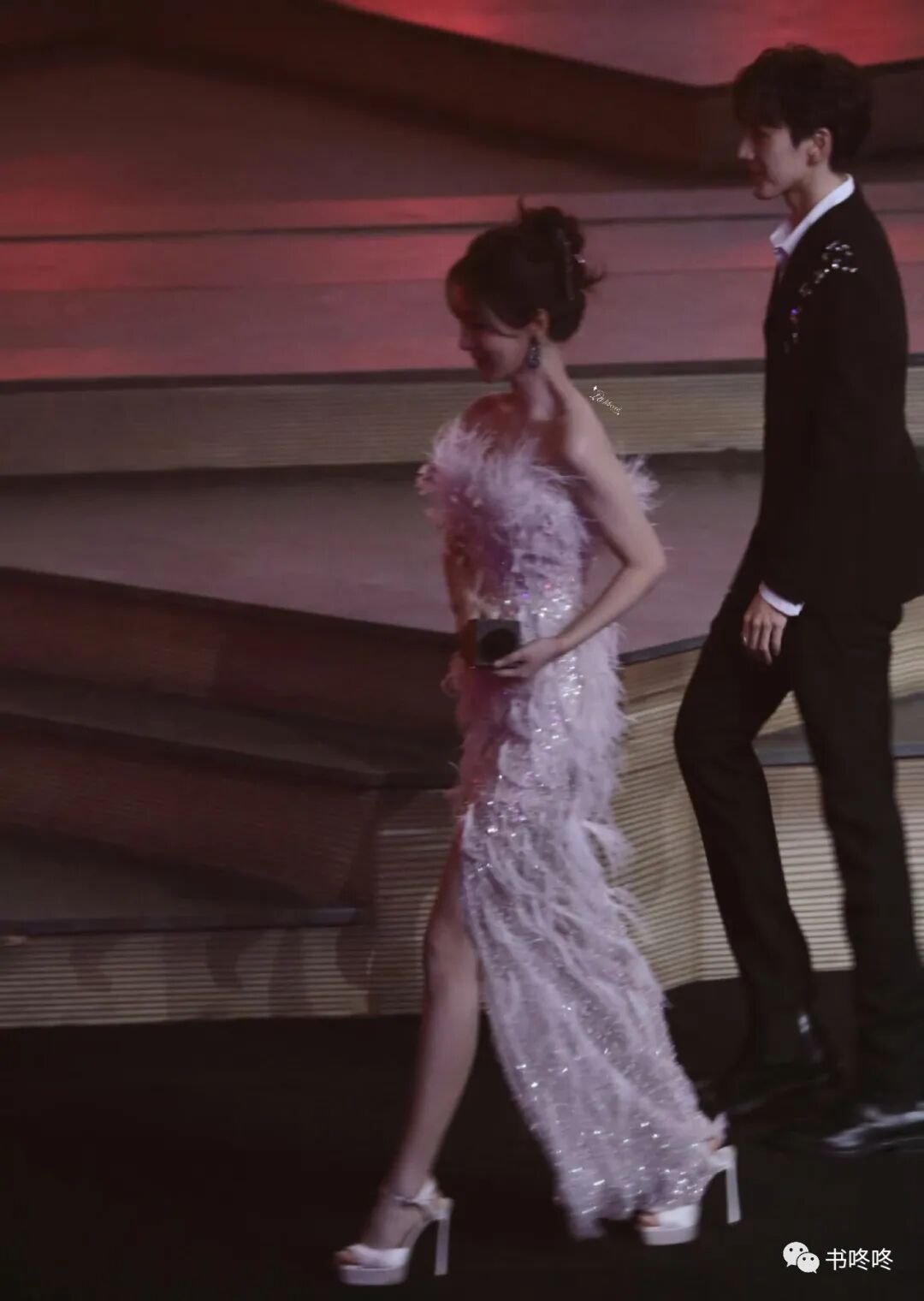 其中杨紫身着羽毛裙惊喜亮相,许久未露面,她瘦了很多,侧面看过去整个人都很单薄。