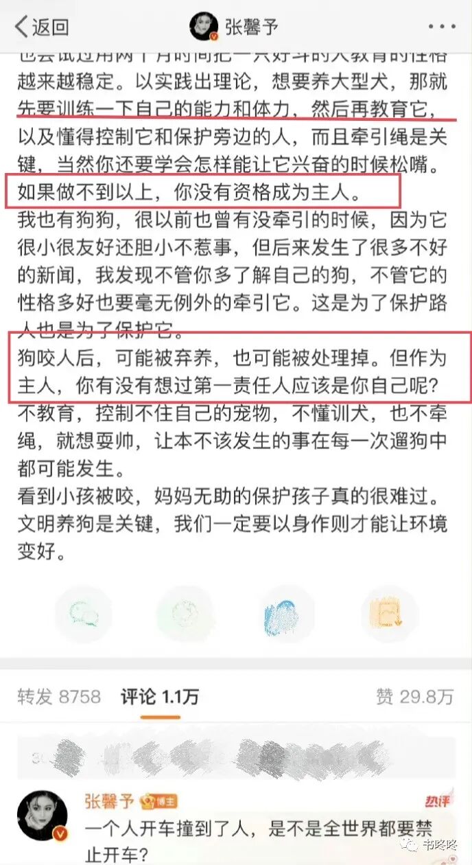 张馨予发声,不过她的文案内容意在告诉大家要“文明养狗”,比如遛狗一定要用狗绳等等。