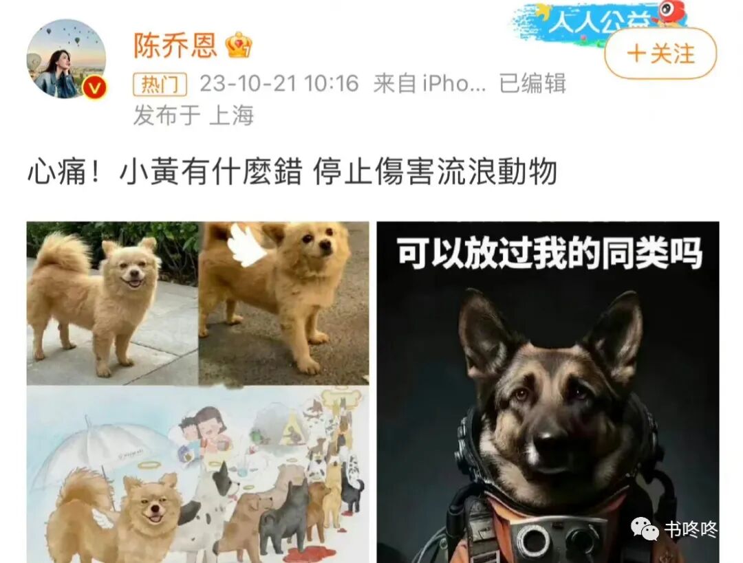 陈乔恩表示“心痛!小黄有什么错,停止伤害流浪动物”。
