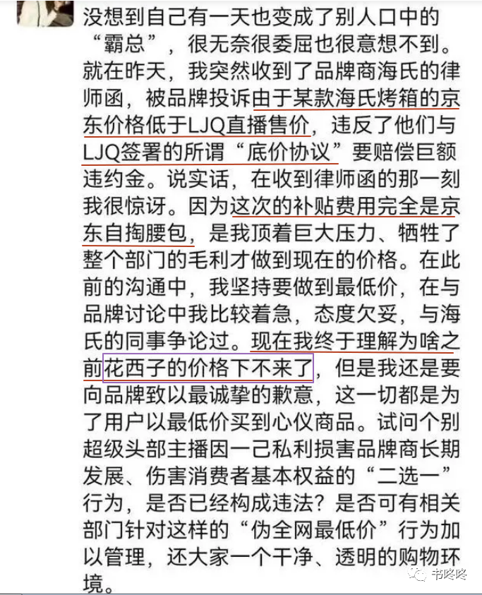 据了解,京东也在双十一期间售卖一款海氏烤箱,因为售卖价格比李佳琦直播间便宜,遭到了投诉,还收到了律师函,需要支付大额赔偿金。