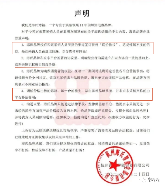 他们声称海氏烤箱在京东平台售卖价格便宜,是平台自己补贴的。