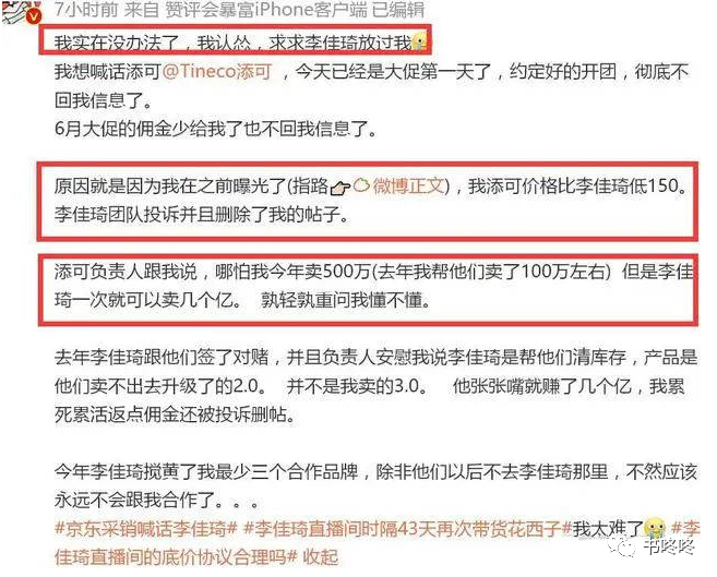 随后京东采销直接将这件事曝了出来,控诉李佳琦方,疑似指责其签订“底价协议”。