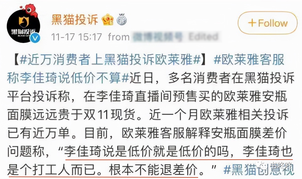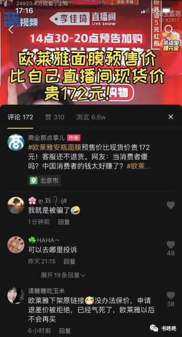 原来他直播间的这款产品售价比李佳琦那边便宜,因为保价协议的关系,品牌方直接让他们下架了。