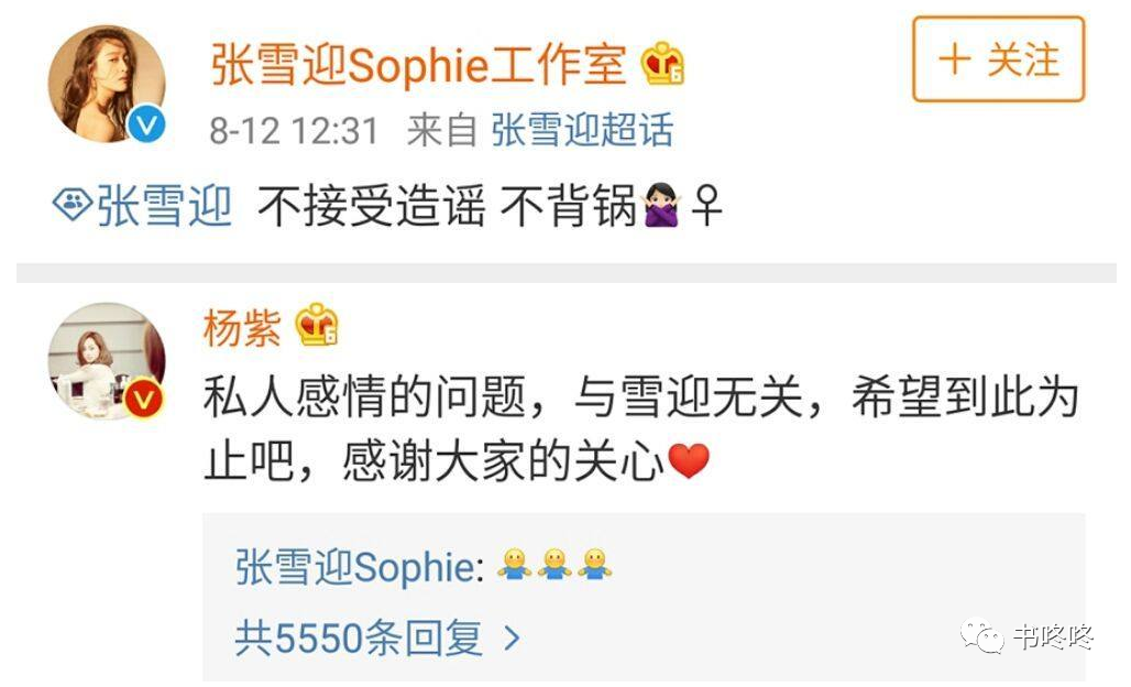 杨紫本人还亲自跑到张雪迎工作室下面评论“私人感情的问题,与雪迎无关”。