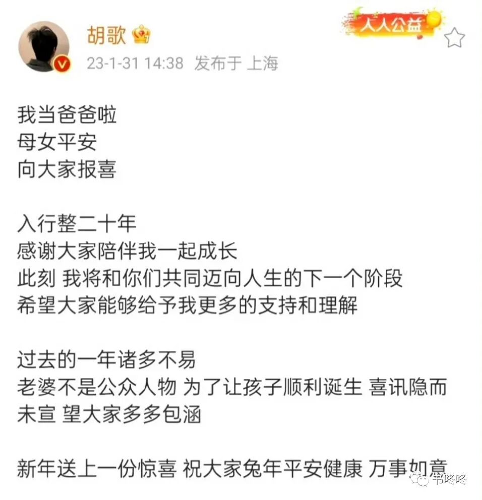 胡歌已婚生女的消息,是他自己公开的,这要放在以前绝对是爆炸性的新闻,狗仔们肯定要居首功。