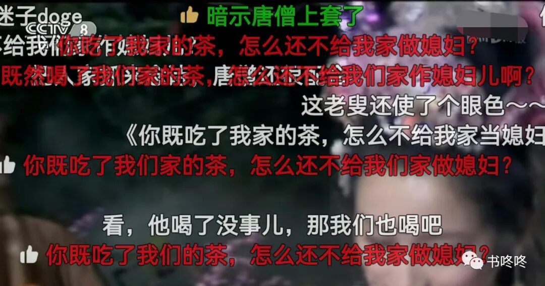 杏仙用迷魂汤迷住了唐僧,弹幕都在说“你既吃了我家的茶,怎能还不给我们家做媳妇?”,这是《红楼梦》里王熙凤调侃贾宝玉和林黛玉的话。