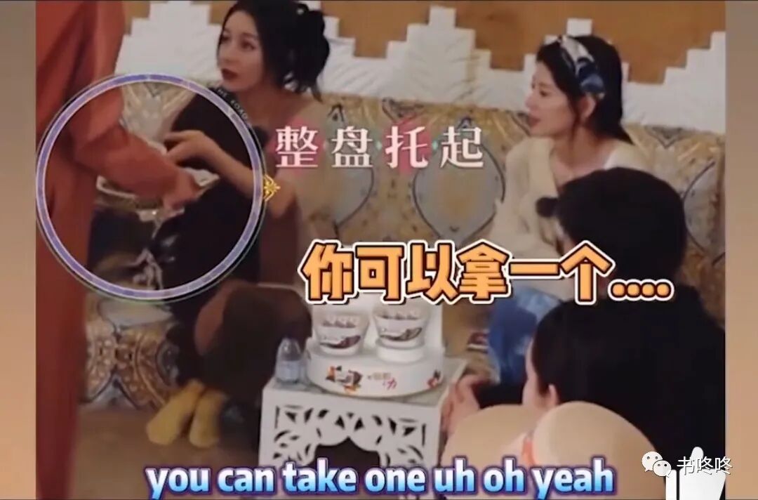 别人递上来后,她见状直接就要端盘子,直到对方示意她才知道,是让自己在盘子里拿一个出来吃。