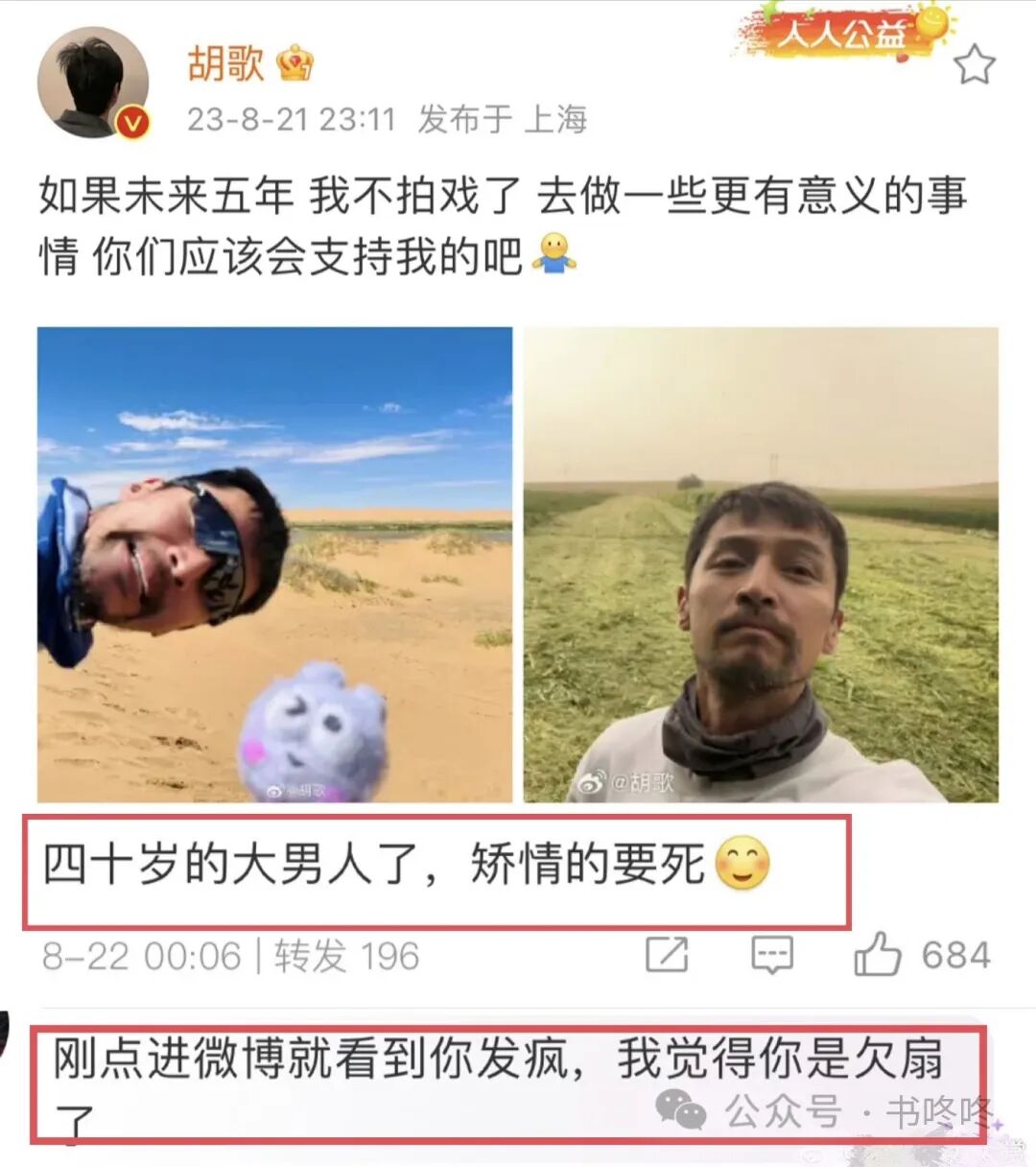 前段时间,胡歌接连在网上“发疯”引起了许多网友的注意,其微博内容直接表示“5年内不想演戏了”。