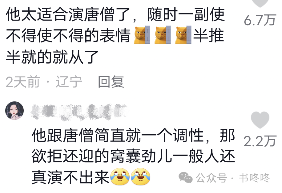 与此同时,有网友表示:他其实也可以演唐僧,那种唯唯诺诺、欲拒还迎的样子太像了。