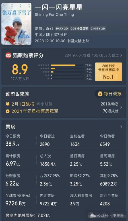 作为2023年年底2024年初元旦档的电影,张佳宁与屈楚萧主演的电影《一闪一闪亮晶晶》出道即巅峰,预售票房就达到了3亿。
