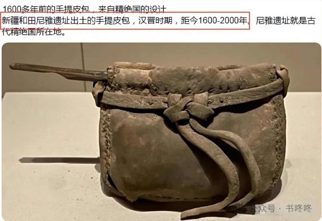 直到前段时间,新疆和田尼雅遗址出土了一款手提皮包,经过专家鉴定,该皮包的生产日期大约在1600年前的汉晋时期。