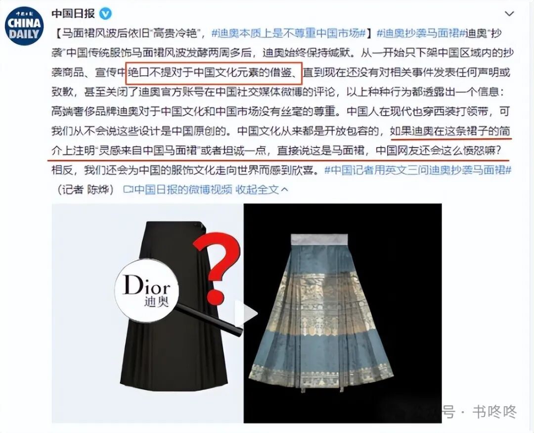许多网友瞬间好像发现了新大陆,再联想前段时间国际大牌迪奥推出的一个新款裙子,其形状就撞了我们古代服饰马面裙。