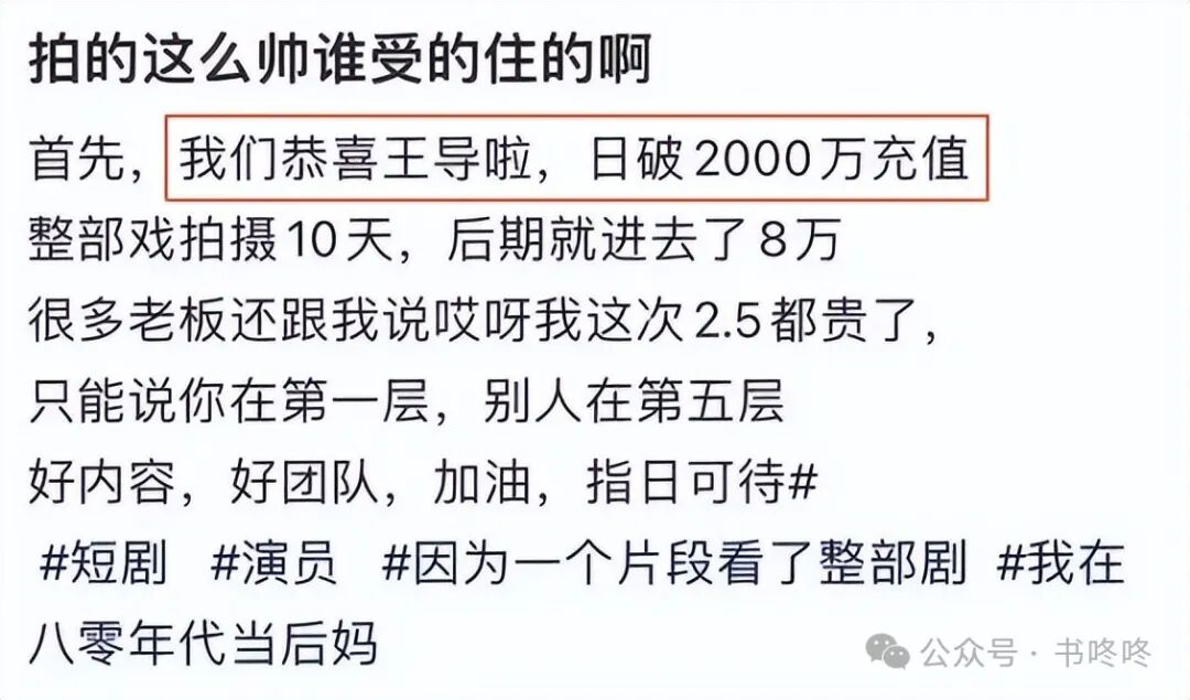 而大家讨论最多的便是一部叫做《我在80年代当后妈》的短剧,据了解,这部作品仅仅拍摄了10天,上映第一天就收到了2000万的充值。