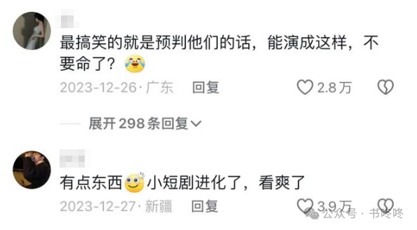 而这一切热度的根源,都与短剧的运营规律完全一致,其剧情和台词基本就是各种热梗和热门语句,以及热门段子故事的集合。