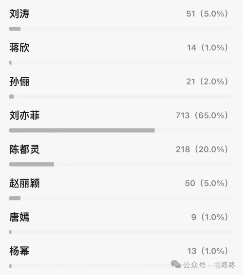 根据网友的投票来看,刘亦菲以绝对的优势位居第一,而陈都灵的票数排在第二。